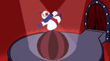 30 second short film of a clown character attempting to balance plates on poles while staying atop